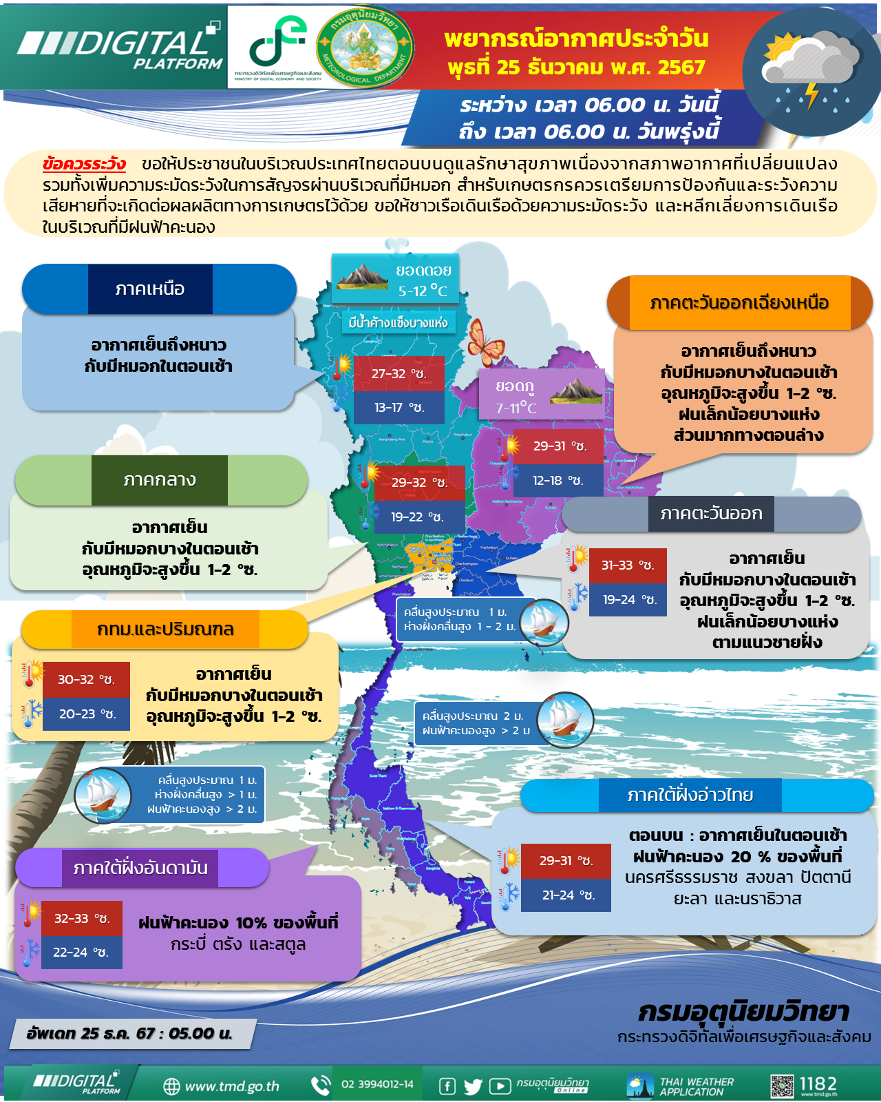 เมื่อวันที่ 25 ธันวาคม กรมอุตุนิยมวิทยา พยากรณ์อากาศ 24 ชั่วโมงข้างหน้า บริเวณความกดอากาศสูง หรือมวลอากาศเย็นยังคงปกคลุมประเทศไทยตอนบน และภาคใต้ตอนบน ลักษณะเช่นนี้ทำให้ภาคเหนือและภาคตะวันออกเฉียงเหนือมีอากาศเย็นถึงหนาว กับมีหมอกในตอนเช้า ส่วนภาคกลาง รวมทั้งกรุงเทพมหานครและปริมณฑล ภาคตะวันออก และภาคใต้ตอนบนมีอากาศเย็นกับมีหมอกบางในตอนเช้า สำหรับบริเวณยอดดอยและยอดภูมีอากาศหนาวถึงหนาวจัดและมีน้ำค้างแข็งบางพื้นที่