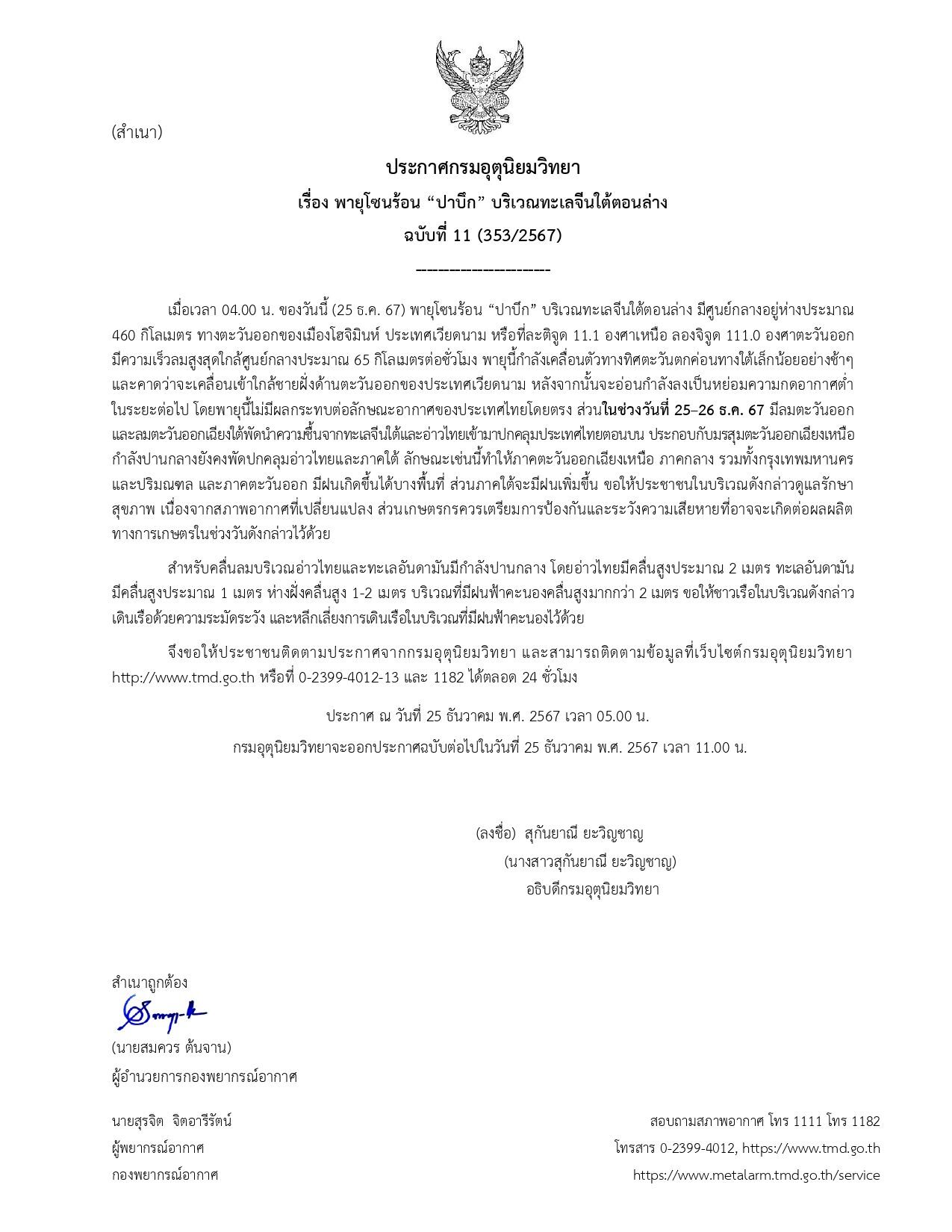 กรมอุตุนิยมวิทยาจะออกประกาศฉบับต่อไปในวันที่ 25 ธันวาคม พ.ศ.2567 เวลา 11.00 น.