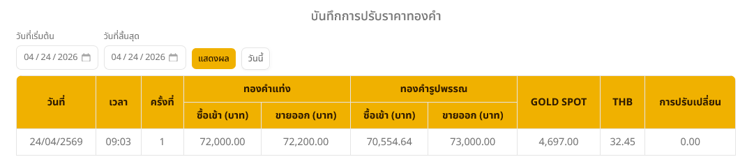 ด้านราคาทองรูปพรรณ รับซื้ออยู่ที่บาทละ 70,554.64 บาท และมีราคาขายออกที่ 73,000.00 บาท ทั้งนี้ ในส่วนของราคาทองคำโลก (Gold Spot) อยู่ที่ระดับ 4,697.00 ดอลลาร์ต่อออนซ์
