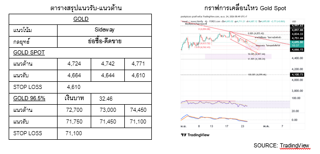 กลยุทธ์การลงทุน เปิดสถานะซื้อ หากราคาไม่หลุด $4,664 หากหลุด $4,664 ชะลอไปเปิดสถานะซื้อบริเวณ $4,644-4,610 ขายทำกำไรหากไม่ผ่าน $4,742-4,722 หากผ่าน $4,722 ชะลอไปขายที่ต้านถัดไป (ตัดขาดทุนสถานะซื้อหากราคาหลุด $4,610)