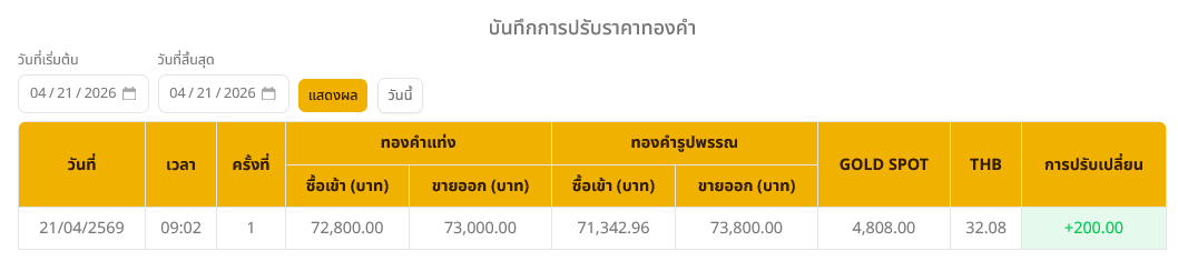 ราคาทองวันนี้ (21 เม.ย. 69) ปรับขึ้น 200 บาท ทองรูปพรรณบาทละ 73,800 บาท