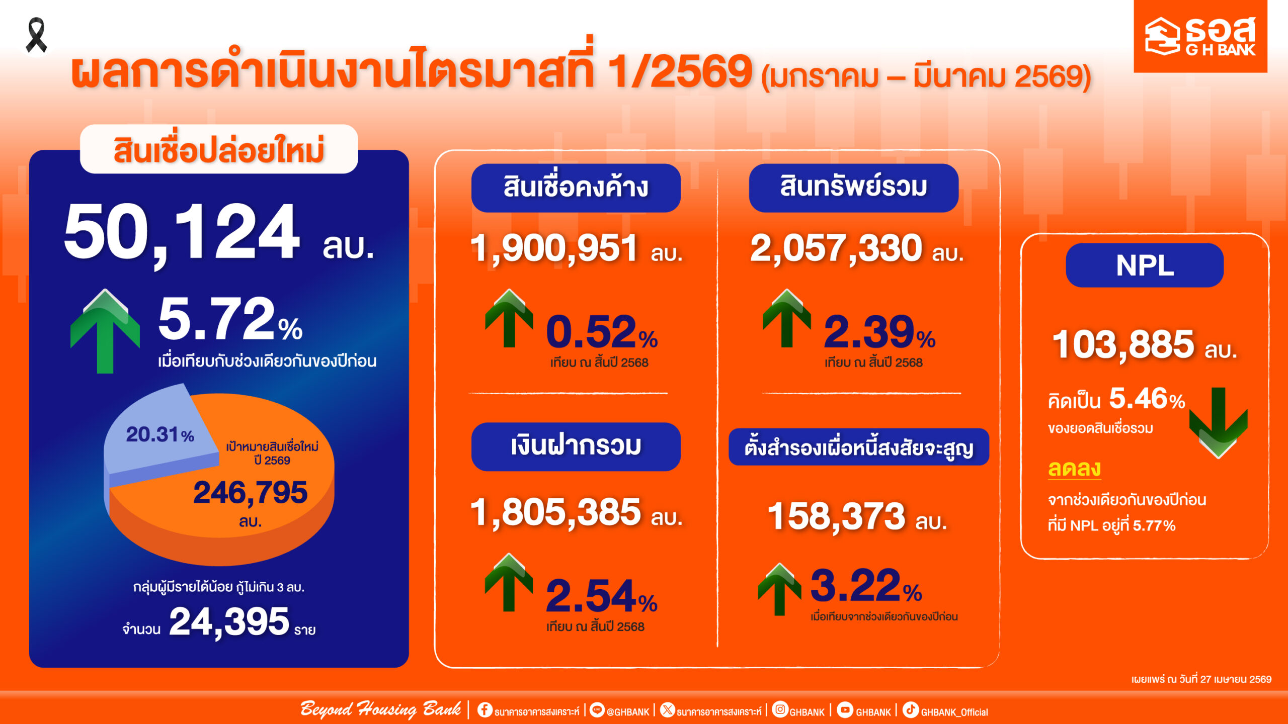 แต่ ธอส. ยังคงบทบาทการเป็นสถาบันการเงินของรัฐ ในการสร้างโอกาสให้คนไทยมีที่อยู่อาศัย และเป็นเครื่องยนต์สาคัญในการกระตุ้นเศรษฐกิจ ผ่านภาคอสังหาริมทรัพย์ได้อย่างแข็งแกร่ง สะท้อนได้จากการปล่อยสินเชื่อใหม่ในไตรมาสที่ 1 ของปี 2569 (ม.ค.-มี.ค. 2569) สามารถปล่อยได้ 50,124 ล้านบาท เพิ่มขึ้น 5.72% เมื่อเทียบกับช่วงเดียวกันปีก่อน