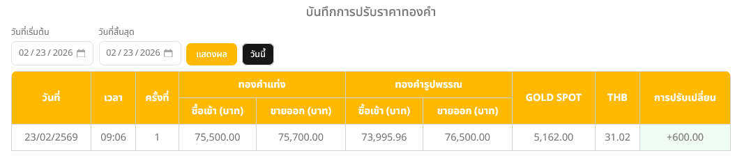 ทองคำแท่งมีราคารับซื้อในประเทศอยู่ที่บาทละ 75,500.00 บาท ขายออกบาทละ 75,700.00 บาท ตามประกาศครั้งที่ 1