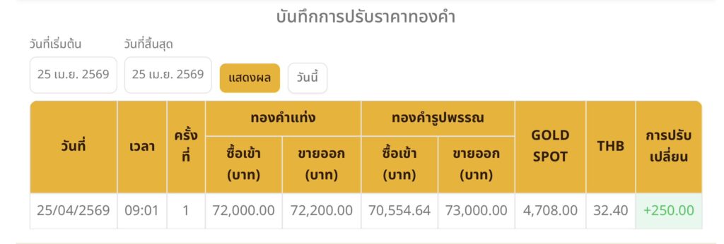ราคาทองวันนี้ (25 เม.ย. 69) ปรับขึ้น 250 บาท ทองรูปพรรณบาทละ 72,750 บาท อัพเดตล่าสุด 25 เมษายน 2569 เวลา 09.01 น.