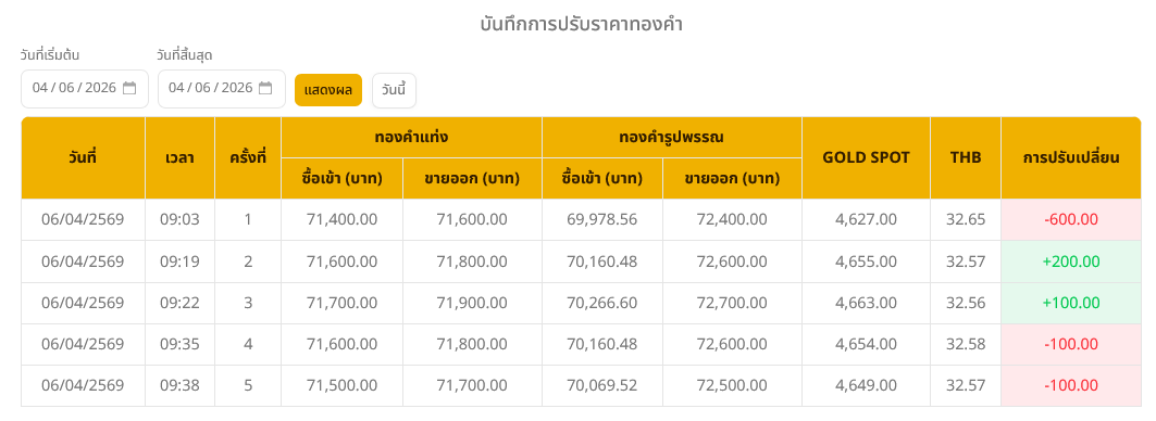 ราคาทองวันนี้ (6 เม.ย. 69) ปรับลง 500 บาท ทองรูปพรรณบาทละ 72,500 บาท