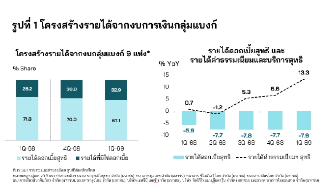 3.ค่าธรรมเนียมและบริการสุทธิอาจเผชิญแรงกดดันมากขึ้นตั้งแต่ช่วงไตรมาสที่ 2/2569 เนื่องจากความต้องการใช้บริการทางการเงินบางประเภทอาจชะลอลงตามกิจกรรมทางเศรษฐกิจที่ซบเซา ขณะเดียวกัน ความผันผวนของตลาดการลงทุนอาจกระทบต่อรายได้ค่าฟีจากธุรกิจบริหารความมั่งคั่ง การขายกองทุนรวม และผลิตภัณฑ์การลงทุนอื่นๆ ซึ่งมักขึ้นอยู่กับบรรยากาศการลงทุนและความเชื่อมั่นของลูกค้า
